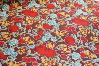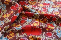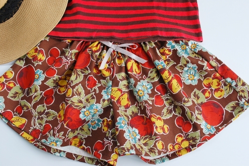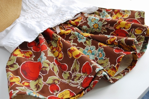 数量1=50cm単位でのオーダーカット販売となります ネコポス1.5m クリックポスト2mまでご利用可能 生地幅約110cm 綿100% ¥429/50cm 程よい厚みのオックス生地です。明るめのブラウンベースに南国の雰囲気漂うフルーツやお花が配されています。 問屋さんでこの生地を見つけた時のドキドキ感!! あるだけすべて仕入れましたが廃盤のようなので再入荷は出来ません。KOKKAさんの生地となります。オックスですが分厚すぎることもなく衣類にもお使いいただけます。透け感がないのでボトムにも安心してお使いいただけます。定価より少しお安く仕入れることができました! 大人の女性でも旅先でならワンピやパンツ、スカートも臆することなく着られそうですね。大柄ですがお子様のワンピースや帽子にしてもかわいいと思います。もちろんバッグやなどの資材系にもおすすめです。オックスは最初は少し固めの風合いですがお洗濯していただくにつれて柔らかくなってきます。とはいえギャザーをたくさん寄せてあるようなデザインのものよりシンプルな形のお洋服がお勧めです。 *サンプルで縫いましたキッズキュロットは100サイズ 糸はシャッペスパン厚地用125番使用 *脱色は見られませんでしたが濃色のため地直しは単品で、お洗濯も念のため数回は単品をオススメいたします 水通後ご利用ください。
