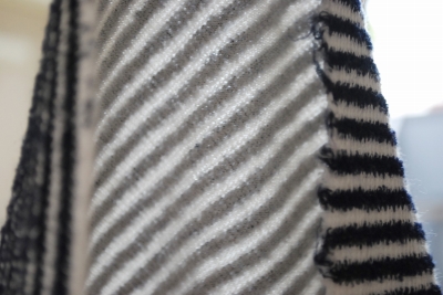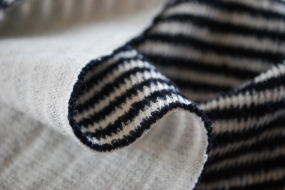 生地幅約150cm ウール45% 綿36%ナイロン19% ¥667/50cm ネコポス不可 クリックポスト50cmまでご利用可能 ポリエステルとレーヨンにポリウレタンが6%(一般的なスパンフライス、スパンテレコは5%)入っている薄手タイプのボーダーの一部(ブルーは表の白部分、グレーとブラックは表のグレーと黒い部分のみ)がもこっとした風合いを出すためにウールです。が、全体を見た時にあまりウールっぽい感じがなく少々厚みは感じますがゆる緩めの編み地なので通年でも大丈夫かな、と思いますが感じ方には個人差があると思うので真夏用のお洋服には自己判断でお願いします、秋〜冬には問題なくお使い頂けます。ウール高混率のため家庭でテスト洗濯をしてみましたが表の片ボーダーのみのウール使用のため縮率は一般的なニットと同等でした。在庫限り再入荷無しなのでシーズンはともかくお求め頂いて損はないと思います!
