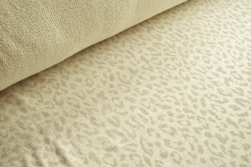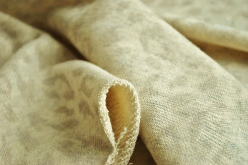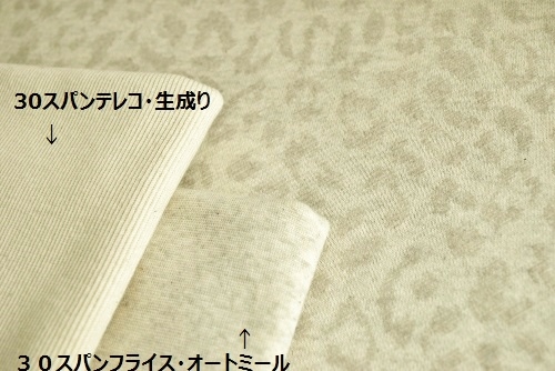 生地幅約145cm コットン100% ¥950/50cm 宅急便配送のみ 今回の仕入れの中で1番高かったのですが残り全反仕入れしたほど気に入った裏毛です。厚みは30/10なので中程度(ごっついということはありません) テンション中〜低 ベースはトップ杢オートミール糸で編んであり、そこに総柄のレオパードをこれでもかとフロッキープリント(樹脂で繊維を植毛してある)してあります。柄が浮き上がって高級感があり、色も同色なので上品!この色をセレクトしてくれた企画の方に感謝です。本当にオススメです。あるだけ全て仕入れたので在庫限りです。フロッキーの取扱いと注意点(特殊なことでは無く市販製品と同等、ご家庭で接着するフロッキーよりは強度があります) *アイロンは80〜120℃で当て布をしてくだい、高温アイロンは表面変化を起こします *フロッキープリントは永久的なものではないので少しづつ植毛してある部分の脱落はおきます(これは技術的に避けられません) *お洗濯は柄側を中表にして洗濯ネットに入れてください、出来れば単品で手洗いしていただいたほうがフロッキーの風合いを長く保てます *フロッキープリントは強く摩擦すると脱落する場合がございます