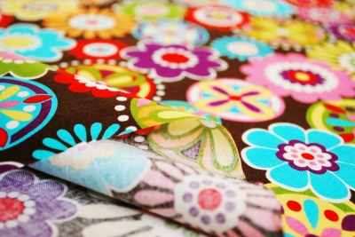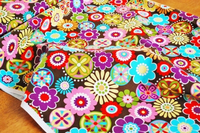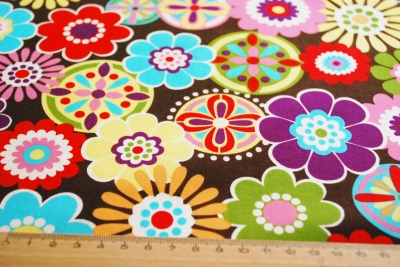 約108cm幅 ¥286/50cm ネコポス・クリックポストご利用可能 インパクト大の大きめな(約6cm前後)花柄です。 生地ベースはこげ茶色です。少しだけ使っても 雰囲気がぐっと変わりそうです!