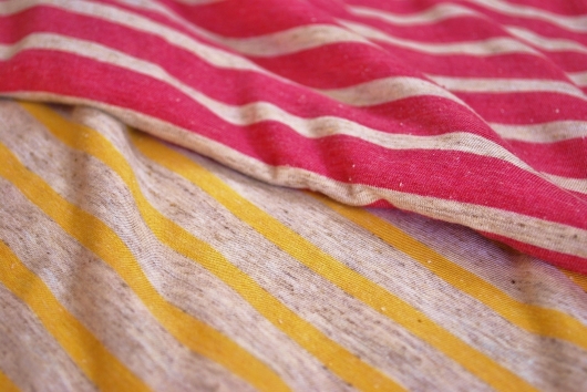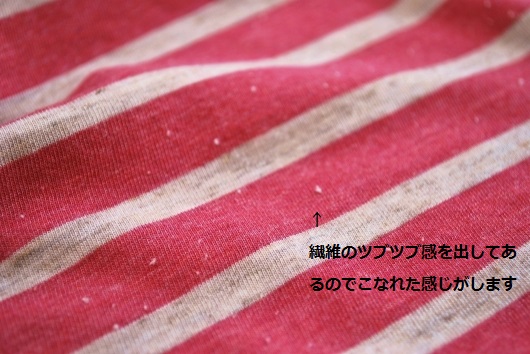 50cm=数量1単位でのオーダーカット販売 ¥858/50cm 生地幅約175cm 綿50%レーヨン50% ネコポス50cm クリックポスト1mまでご利用可能 肌触りの良いレーヨンに綿のラフ感を加えた粗挽きのTOP糸で編まれたボーダーです。サラリとした薄手で落ち感もあるので大人の女性にもおすすめです。 繊維のつぶつぶが残してあるのでこなれた感が出ているように思います。オススメの付属がしっくりくるものがあまりなかったのですが一応の同系色であわせてみましたのでご参考まで。 仕入れ先に在庫があれば再入荷可能。水通し後ニット用の糸と針で縫製してください