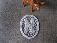 アンティーク風のイニシャルモチーフ、Nが2枚のセットです。コットン100% 縦約55mm 横約45mm 繊細なレースです、バッグやお洋服のワンポイントにぜひ!縫い付けタイプです すべての配送方法ご利用可能